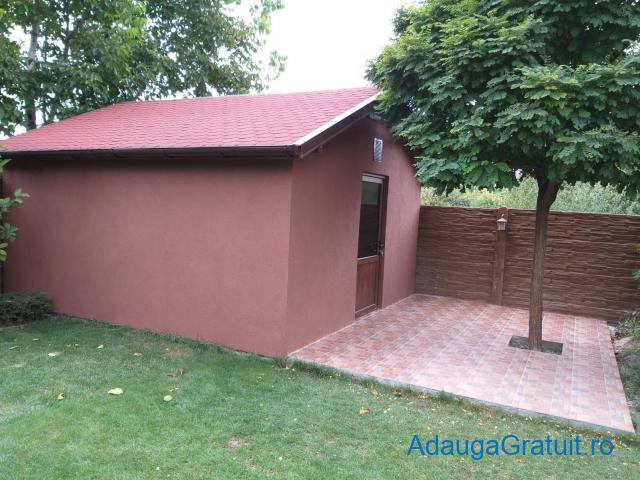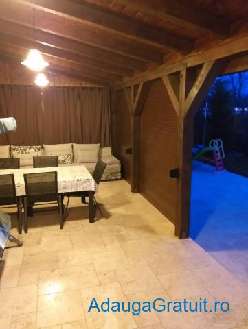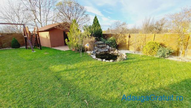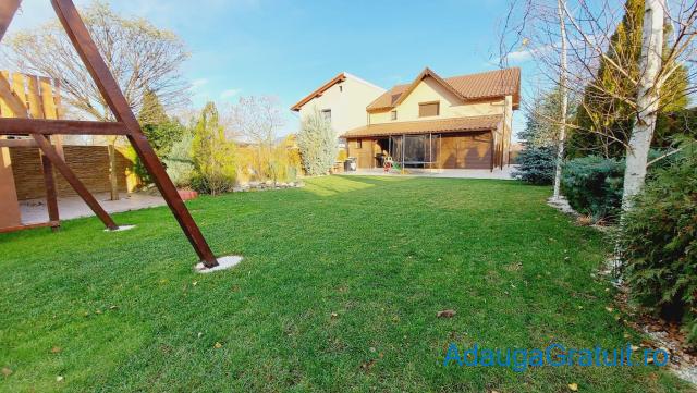 Casa are suprafata utila de aproximativ 200 mp, teren 800 mp, terasa 50 mp, camera tehnica 5 mp, casuta de lemn 22 mp plus terasa descoperita 15 mp, avand 5 camere, 3 bai, 2 dressinguri, 2 bucatarii, 2 terase, garaj dublu, camera tehnica, casuta de lemn in curte, spatiu depozitare, loc de joaca penteu copii, fantana cu cascada .